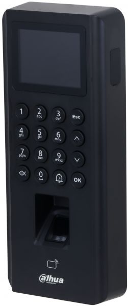 Autonomní čtečka karet s mechanickou klávesnicí, displejem a otiskem prstů. Možnost připojení druhé externí čtečky a použití pro řízení obousměrného průchodu. Autorizace uživatele otiskem, zadáním kódu, přiložením karty nebo potvrzení karty kódem. Pro obsluhu dveří je možné dále využít vstup pro odchodové tlačítko. Nastavení přes webové rozhraní nebo z programu SmartPSS Lite. Dohled z DMSS. Plastové provedení PC+ABS. Napájení PoE nebo 12 VDC.