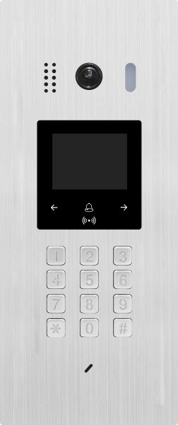 Dveřní stanice pro zápustnou montáž vybavená kamerou se StarLight čipem, LED přísvitem se senzorem setmění. Integrovaná RFID čtečka umožňuje otevření zámku pomocí čipu/karty. Klávesnice slouží pro otevření zámku zadáním kódu a volání účastníka pomocí kódové volby. Volání lze také uskutečnit výběrem ze jmenného seznamu účastníků na displeji. Součástí balení je povrchová stříška.