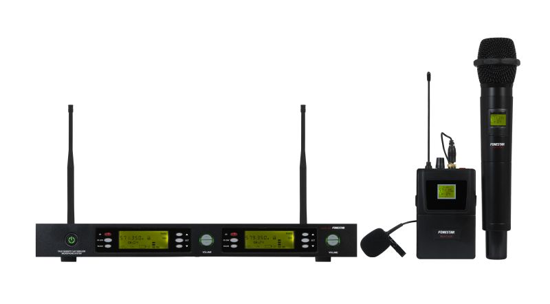 Dvoukanálový UHF systém (631–645 MHz) s 1× ručním (elektret) a 1× klopovým mikrofonem (elektret, bodypack). True diversity, auto-scan, IR. 2× XLR, 2× 6,3 mm + mix out. 19" 1U montáž, 2× 6,3 mm jack kabel.