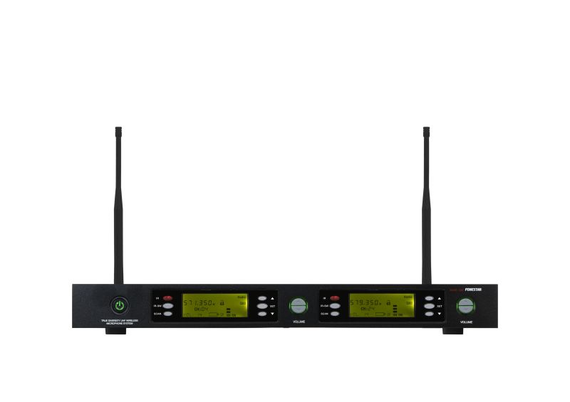 Dvoukanálový UHF přijímač, true diversity. 32 frekvencí (631–645 MHz).