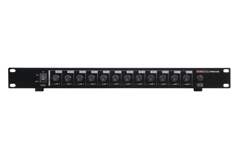 Fonestar MX-824 je 12kanálový analogový mikrofonní mixér s nezávislým ovládáním hlasitosti každého kanálu a 48V fantomovým napájením. Umožňuje snadné rozšíření počtu mikrofonních vstupů v PA systémech a poskytuje jeden stereo výstup pro připojení k zesilovači nebo dalšímu zařízení. Spolehlivé řešení pro konferenční sály, instalace veřejného ozvučení a studiové aplikace.