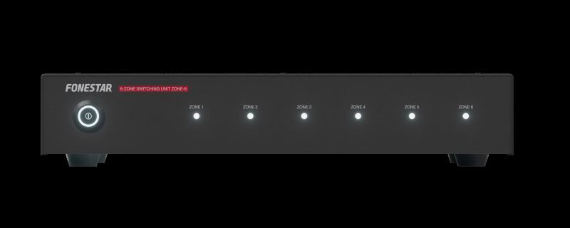 Fonestar ZONE-6 je 6zónová výstupní spínací jednotka určená pro propojení se zónovým mikrofonem ZONEMIC-6. Umožňuje nezávislá hlášení do vybraných zón a sepnutí kontaktu pro připojení k regulátorům hlasitosti nebo dalším systémům, jako jsou poplašné instalace.