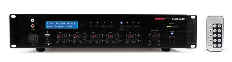 Fonestar MPA-124U je jednozónový PA zesilovač s výkonem 120 W RMS, určený pro profesionální ozvučení komerčních prostor. Nabízí vestavěný USB/SD přehrávač, 4 volitelné vstupy (mikrofonní a pomocné) a funkce prioritního řízení pro hlášení a evakuační systémy. Zesilovač podporuje přehrávání hudby na pozadí i oznamování s využitím různých zvukových tónů. Vhodný pro obchody, restaurace, školy, kanceláře a veřejné prostory.