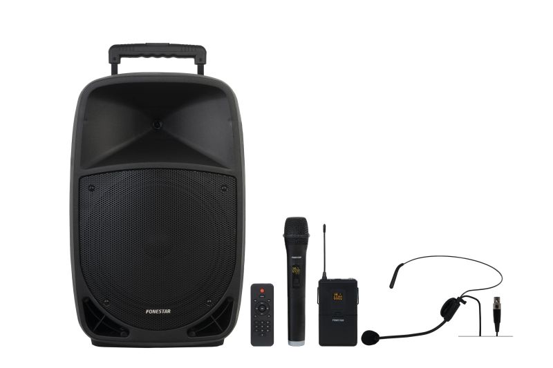 Přenosný reproduktor 12” s dvojicí UHF bezdrátových mikrofonů (1 ruční, 1 na hlavě), Bluetooth/USB/microSD/FM/LINE přehrávačem, výkonem až 250 W (50 W RMS), funkcí karaoke s Voice Canceller, prioritou hlasu, samostatnou regulací hlasitosti, basů a výšek, úpravou tónu, možností připojení kytary a výstupu pro další reproduktor, lithium baterií s výdrží až 16h při 50 % hlasitosti, transportním vozíkem a robustní konstrukcí.